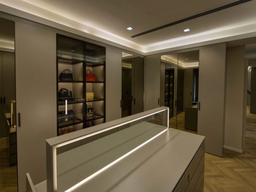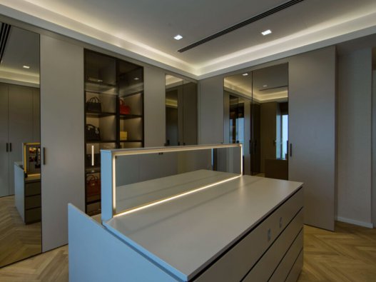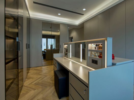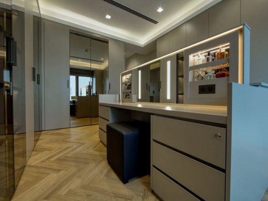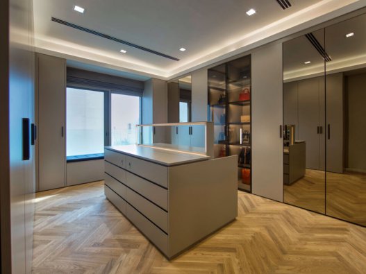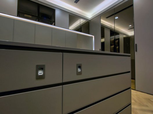 Schmalenbach’s bespoke design team crafted a distinct and elegant yet functional wardrobe space for a key client in Mohammed Bin Rashid City District One. The project features a centerpiece storage cabinet with built in lights that amplifies the premium luxurious exterior finish. The design combines laminate sand grey velvet, mirror and glass doors and aluminum gold bronze rail that create a perfect balance of sophistication and minimalism. Mirrored doors are selectively fitted keeping in mind contemporary trends in luxury wardrobe designs. The sleek detailed finishes underline distinctive German wardrobe design craftsmanship.