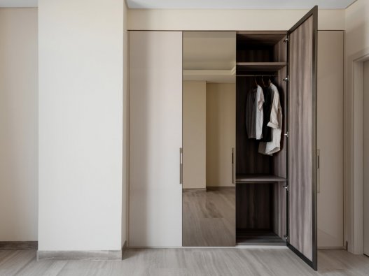 Schmalenbach’s TH8 built-in closet design is the perfect combination of simplicity and functionality. The custom-made closet was installed for a client in Palm Jumeirah, Dubai. It’s muted sand brown matt finish and mirrored doors are carefully selected to blend with the interiors. The cabinets, shelves and drawers in TH8 built-in closet have been purposefully built for wider storage space. In addition, the built-in closet was fitted with Schmalenbach’s cabinet and drawer pulls that add a touch of personalisation.