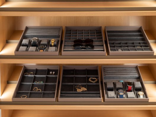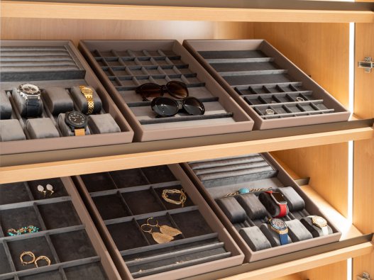 Al Gurg Living’s interior design team furnish a lavish Abu Dhabi residence with simply sophisticated pure white accent closet. The fully bespoke project was achieved in partnership with Schmalenbach Design. White cream accent with contrasting dark metallic door handles render an opulent aesthetic to the overall look. The closet island positions as the centerpiece for the walk-in closet. The tall cabinetry for storing apparels and accessories are also built with pull-out mechanism drawers for ties and throws. Exclusive velvet jewellery and watch inserts are integrated for securing precious valuables. Opulent LED lighting fixtures create a vibrant ambience.