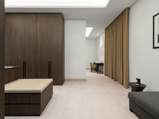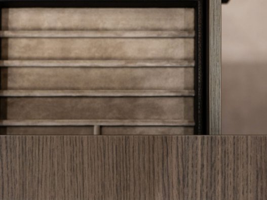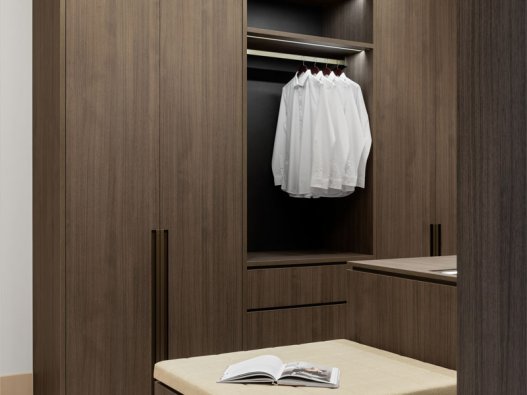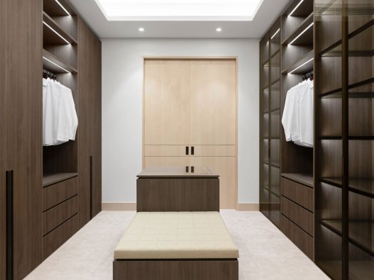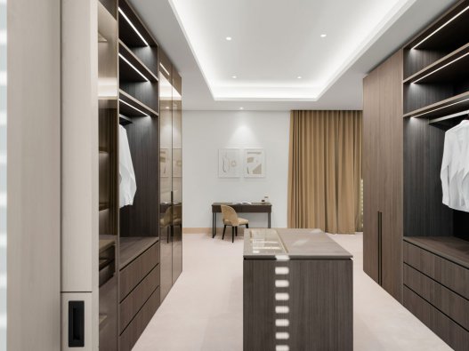Schmalenbach’s latest walk-in closet project within a residence in Dubai Hills has a soho urban look and feel. Made using robust wooden material and mirror-fitted doors; the pairing of dark brown and sand hues on the exterior perfectly blends with pure white wall finishing. The wardrobe cabinets and drawer spaces offer wide storage area, whilst the centerpiece closet island provides room to store ornate jewellery and accessories. Lighting fixtures have been intelligently integrated to offer a well-lit space throughout the walk-in closet. This project is yet another showpiece of Schmalenbach's detailed German craftsmanship in bespoke walk-in closet design.